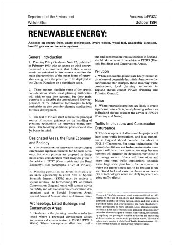 Renewable Energy Annexes on Energy from Waste Combustion, Hydro Power, Wood Fuel, Anaerobic Digestion, Landfill Gas and Active Solar Systems ... Policy Guidance Notes PPG 22 Annexes) full version