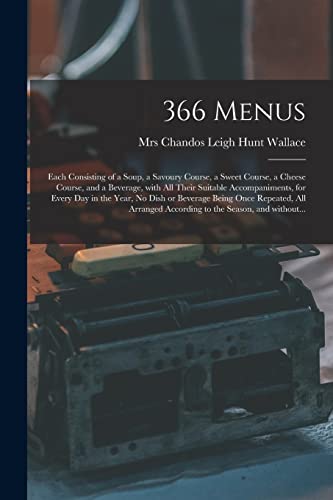 You are about to access our book library "366 Menus: Each Consisting of a Soup, a Savoury Course, a Sweet Course, a Cheese Course, and a Beverage, With All Their Suitable Accompaniments, for ... All Arranged According to the Season, ... full version"