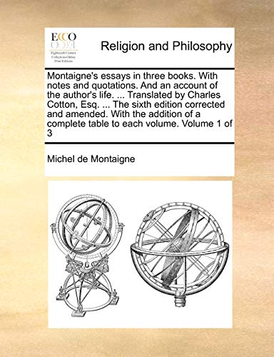 You are about to access our book library "Montaigne's essays in three books. With notes and quotations. And an account of the author's life. ... Translated by Charles Cotton, Esq. ... The ... complete table to each volume. Volume 1 of 3 full version"