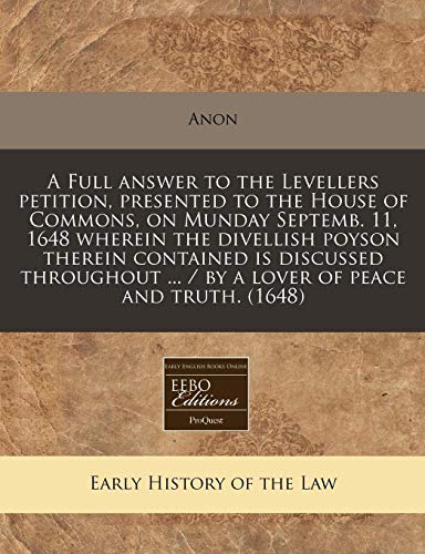 You are about to access our book library "A Full answer to the Levellers petition, presented to the House of Commons, on Munday Septemb. 11, 1648 wherein the divellish poyson therein contained ... ... / by a lover of peace and truth. (1648) full version"