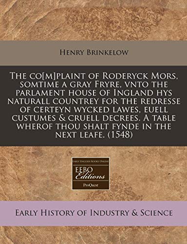 You are about to access our book library "The co[m]plaint of Roderyck Mors, somtime a gray Fryre, vnto the parlament house of Ingland hys naturall countrey for the redresse of certeyn wycked ... thou shalt fynde in the next leafe. (1548) full version"