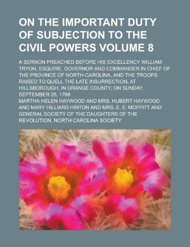 You are about to access our book library "On the important duty of subjection to the civil powers; A sermon preached before His Excellency William Tryon, esquire, governor and commander in ... the troops raised to quell the late Volume 8 full version"