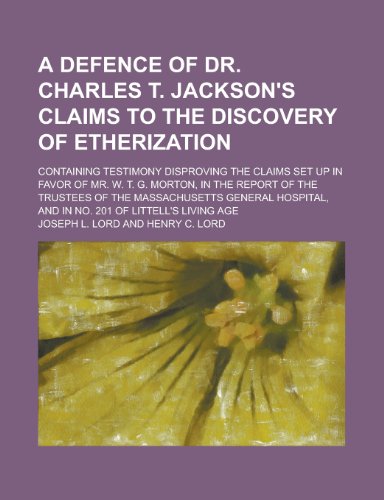 You are about to access our book library "A defence of Dr. Charles T. Jackson's claims to the discovery of etherization; Containing testimony disproving the claims set up in favor of Mr. W. T. ... of the Massachusetts General Hospital, and in full version"
