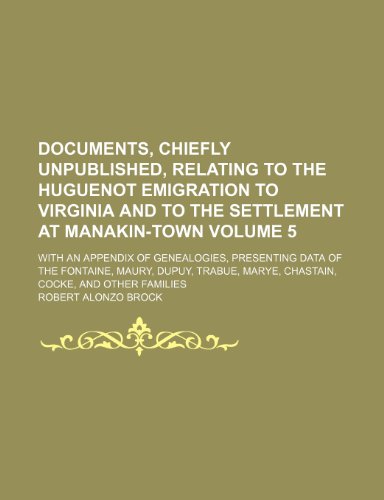 Documents, chiefly unpublished, relating to the Huguenot emigration to Virginia and to the settlement at Manakin-Town Volume 5 ; with an appendix of ... Marye, Chastain, Cocke, and other fami full version