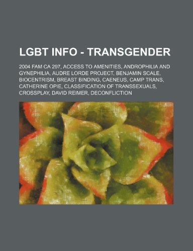 You are about to access our book library "Lgbt Info - Transgender: 2004 Fam CA 297, Access to Amenities, Androphilia and Gynephilia, Audre Lorde Project, Benjamin Scale, Biocentrism, Breast Binding, Caeneus, Camp Trans, Catherine Opie, Classification of Transsexuals, Crossplay, David Reimer, Deco full version"