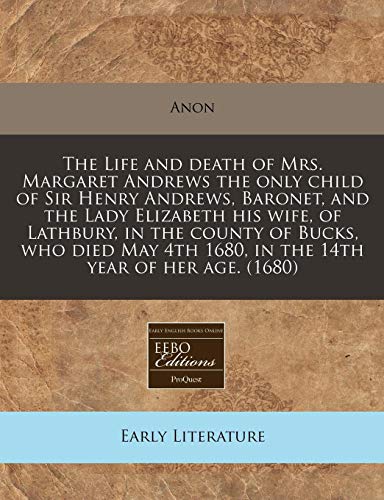 You are about to access our book library "The Life and death of Mrs. Margaret Andrews the only child of Sir Henry Andrews, Baronet, and the Lady Elizabeth his wife, of Lathbury, in the county ... 4th 1680, in the 14th year of her age. (1680) full version"
