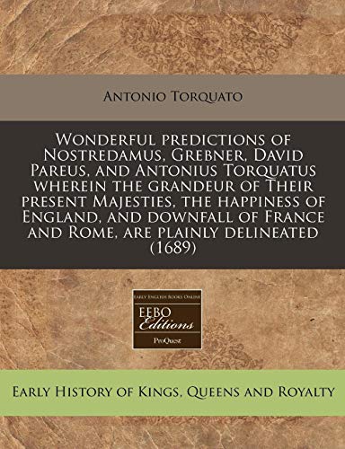 You are about to access our book library "Wonderful predictions of Nostredamus, Grebner, David Pareus, and Antonius Torquatus wherein the grandeur of Their present Majesties, the happiness of ... and Rome, are plainly delineated (1689) full version"