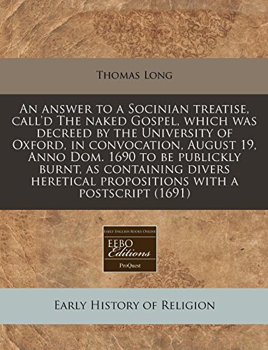 You are about to access our book library "An answer to a Socinian treatise, call'd The naked Gospel, which was decreed by the University of Oxford, in convocation, August 19, Anno Dom. 1690 to ... propositions with a postscript (1691) full version"