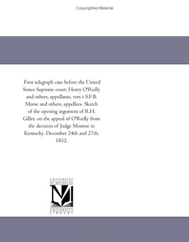 You are about to access our book library "First telegraph case before the United States Supreme court. Henry O'Rielly and others, appellants, vers s S.F.B. Morse and others, appellees. Sketch ... from the decision of Judge Monroe in K full version"