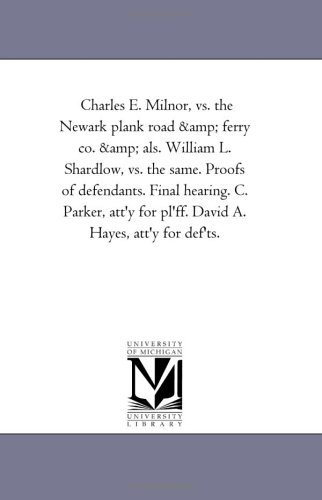 You are about to access our book library "Charles E. Milnor, vs. the Newark plank road & ferry co. & als. William L. Shardlow, vs. the same. Proofs of defendants. Final hearing. C. Parker, att'y for pl'ff. David A. Hayes, att'y for def'ts. full version"