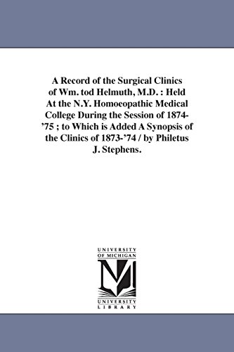 You are about to access our book library "A record of the surgical clinics of Wm. Tod Helmuth, M.D. : held at the N.Y. Homoeopathic Medical College during the session of 1874'75 ; to which is ... clinics of 1873'74 / by Philetus J. Stephens. full version"