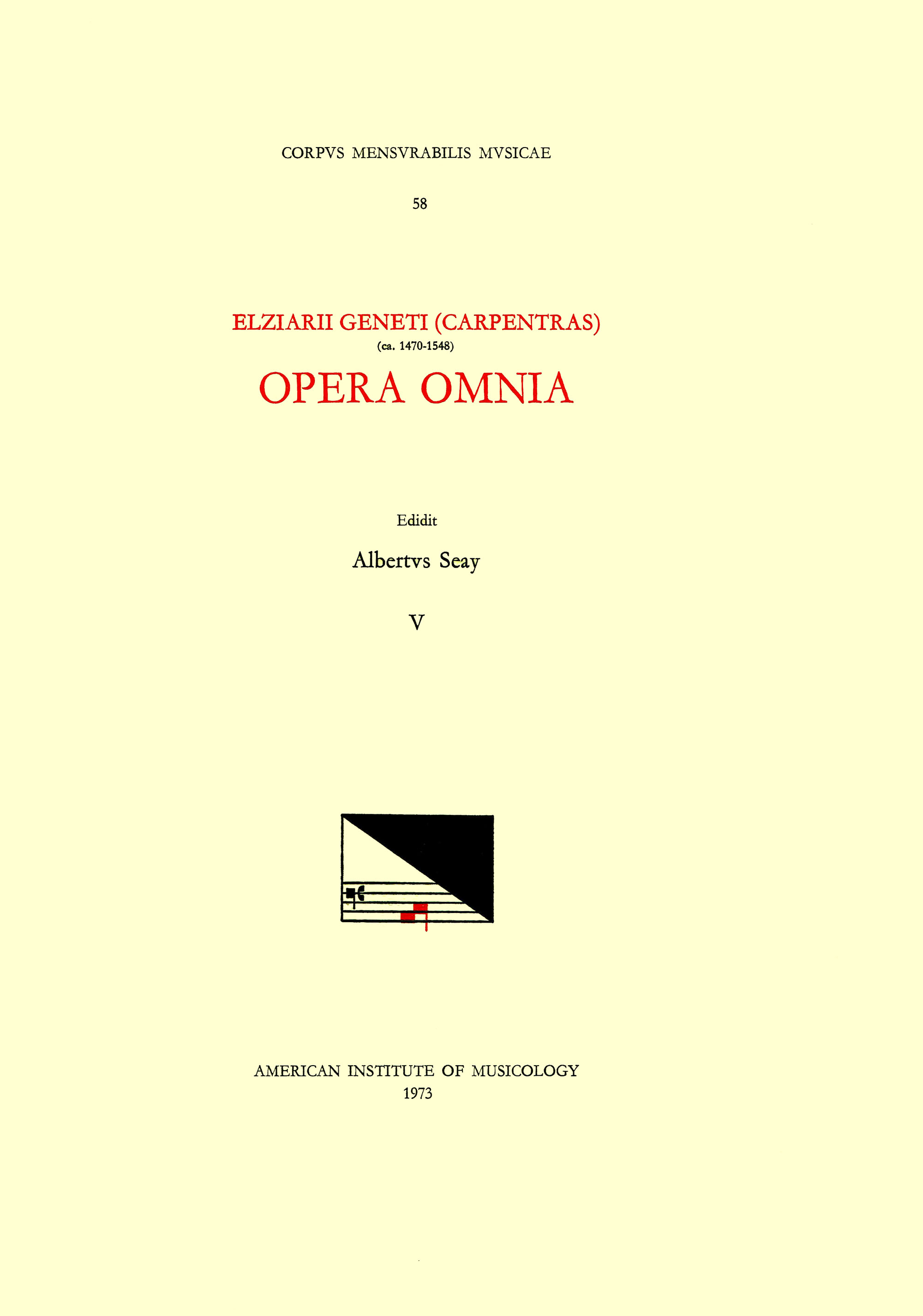 CMM 58 ELZÉAR GENET (CARPENTRAS) (ca. 1470-1548), Opera Omnia, edited by Albert Seay in 5 volumes. Vol. V [Residuum: Motets, madrigals, a chanson] full version