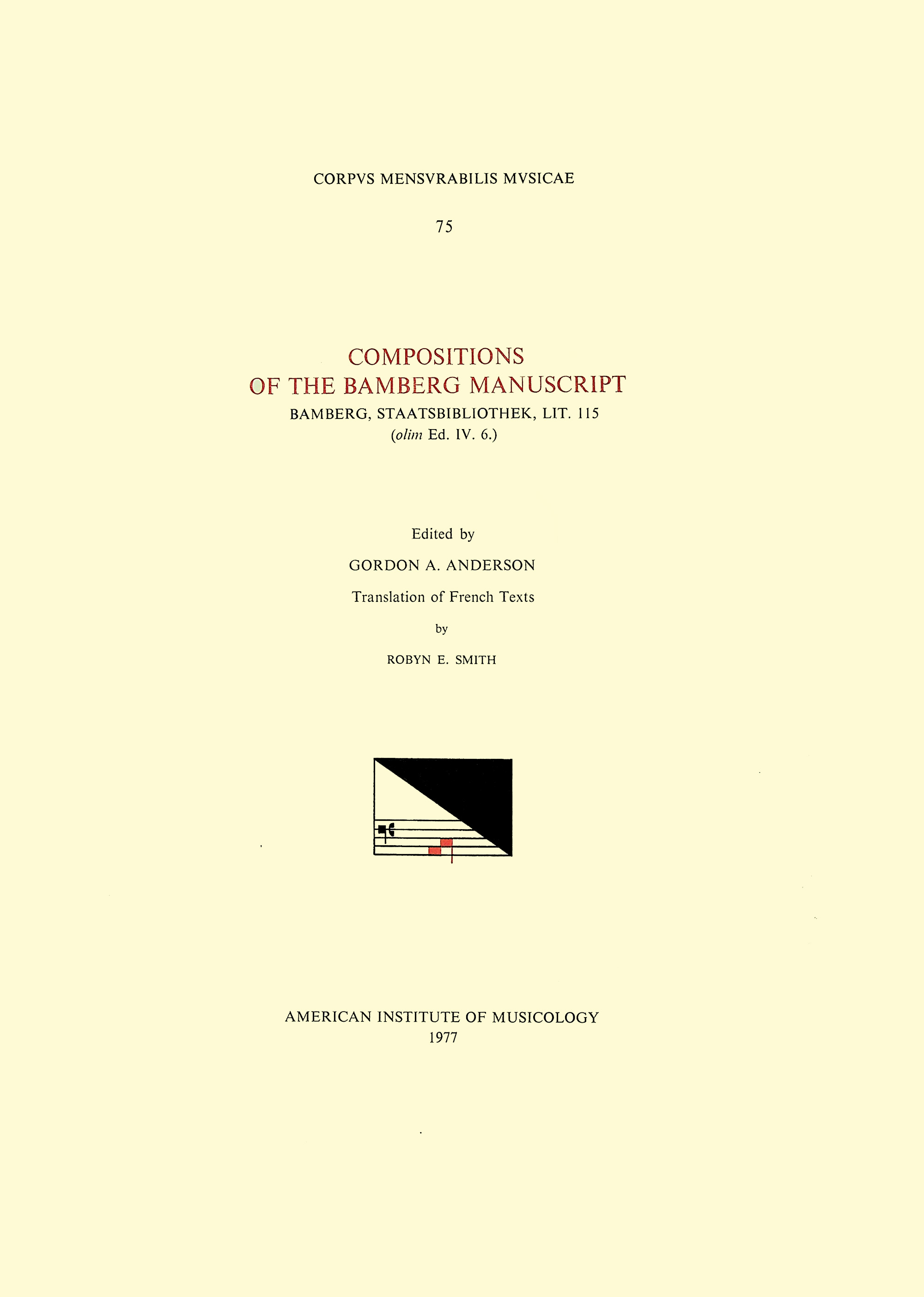 CMM 75 Compositions of the Bamberg Manuscript Bamberg, Staatsbibliothek, Lit. 115 (olim Ed. IV.6.), edited by Gordon A. Anderson full version