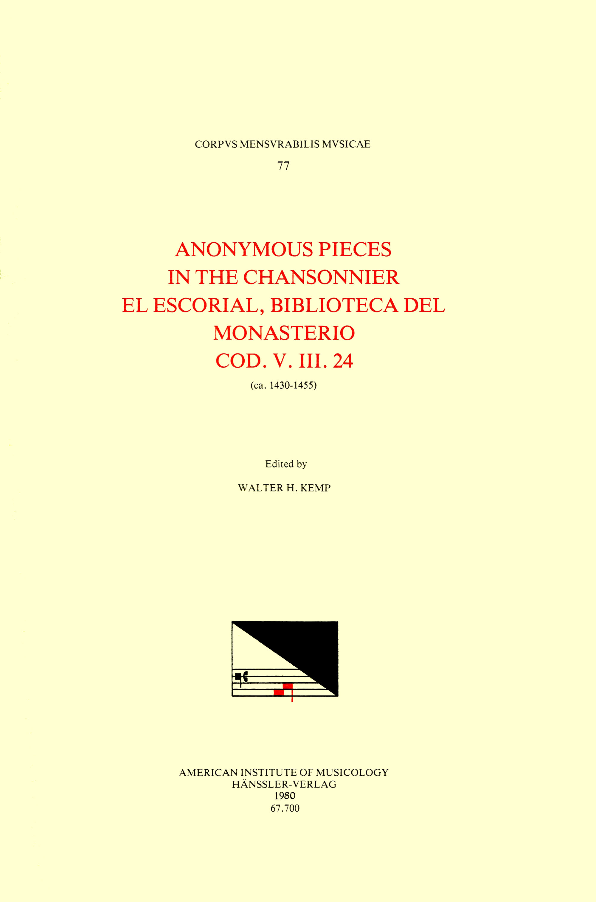 CMM 77 The Anonymous Pieces in MS El Escorial Bibl. del Monasterio, V.III.24 (15th c.), edited by Walter H. Kemp in 1 volume full version