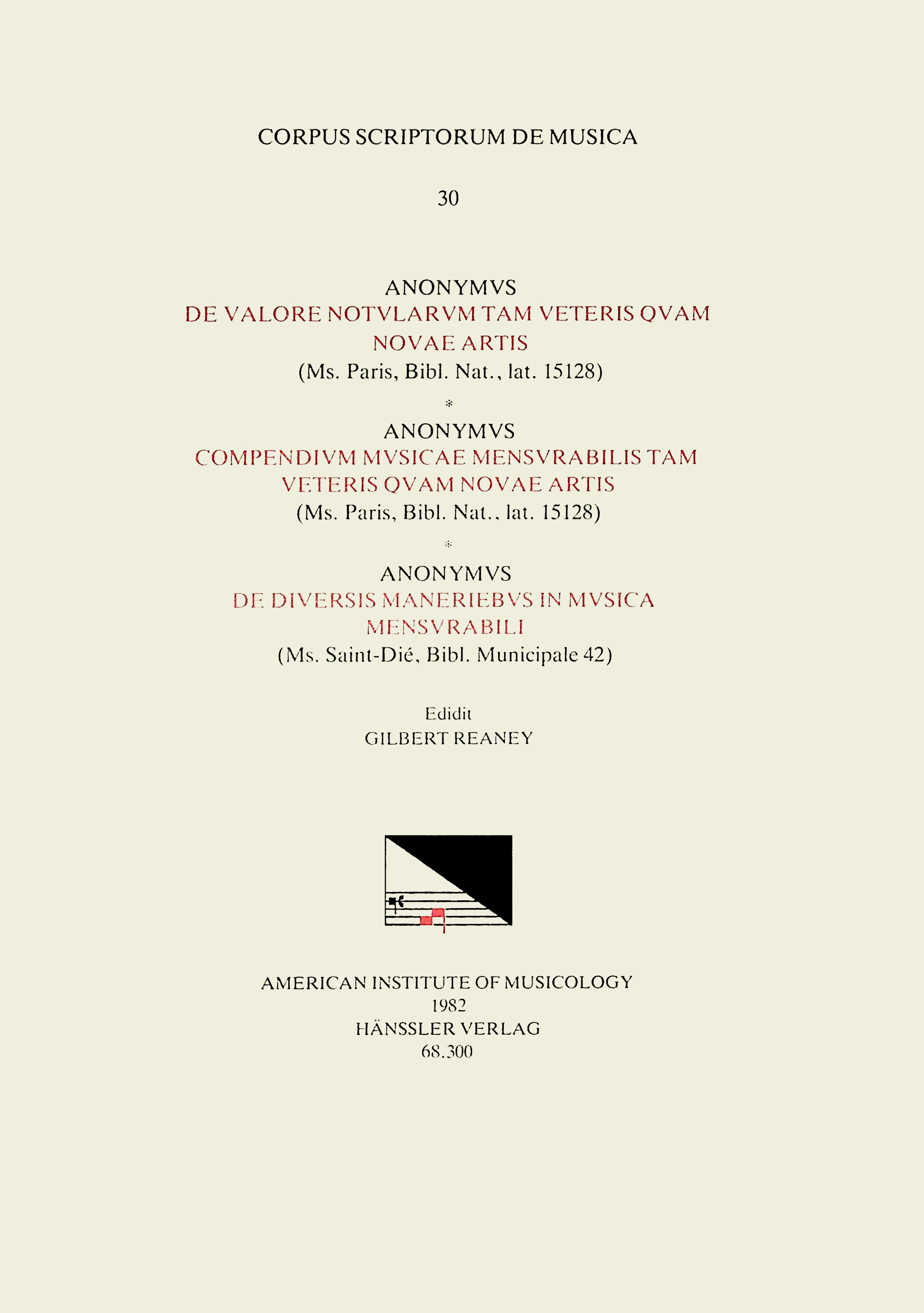 You are about to access our book library "CSM 30 a) ANONYMOUS, De valore notularum tam veteris quam novae artis; b) ANONYMOUS, Compendium musicae mensurabilis tam veteris quam novae artis; c) ANONYMOUS, De diversis maneriebus in musica mensurabili, edited by Gilbert Reaney full version"