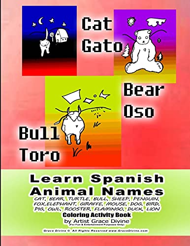 You are about to access our book library "Learn Spanish Animal Names CAT, BEAR, TURTLE, BULL, SHEEP, PENGUIN, FOX,ELEPHANT, GIRAFFE, MOUSE, DOG, BIRD, PIG, OWL, ROOSTER, FLAMINGO, DUCK, LION Coloring Activity Book by Artist Grace Divine ( full version"