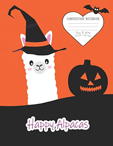 Composition Notebook: With Picture Space And Primary Ruled Lines To Draw And Write; Happy Alpacas The Wizard & Pumpkin Design, 130 Pages full version