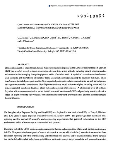 Contaminant Interferences with Sims Analyses of Microparticle Impactor Residues on Ldef Surfaces full version