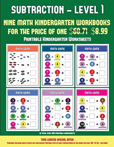 Printable Kindergarten Worksheets (Kindergarten Subtraction/taking away Level 1): 30 full color preschool/kindergarten subtraction worksheets that can ... 8 additional PDF books worth $60.71) full version