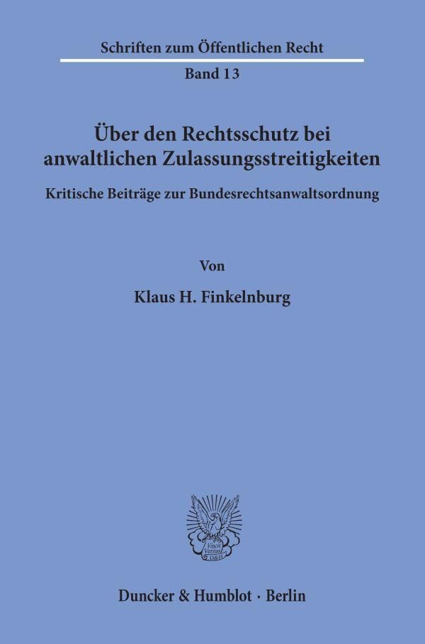 Uber Den Rechtsschutz Bei Anwaltlichen Zulassungsstreitigkeiten: Kritische Beitrage Zur Bundesrechtsanwaltsordnung (Schriften Zum Offentlichen Recht, 13) (German Edition) full version
