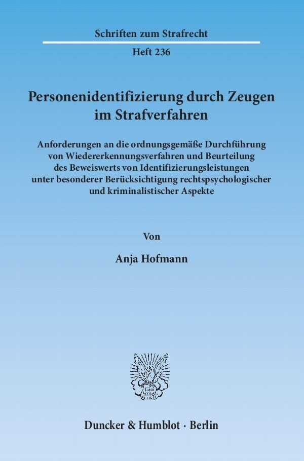 Personenidentifizierung Durch Zeugen Im Strafverfahren: Anforderungen an Die Ordnungsgemasse Durchfuhrung Von Wiedererkennungsverfahren Und ... (Schriften Zum Strafrecht) (German Edition) full version