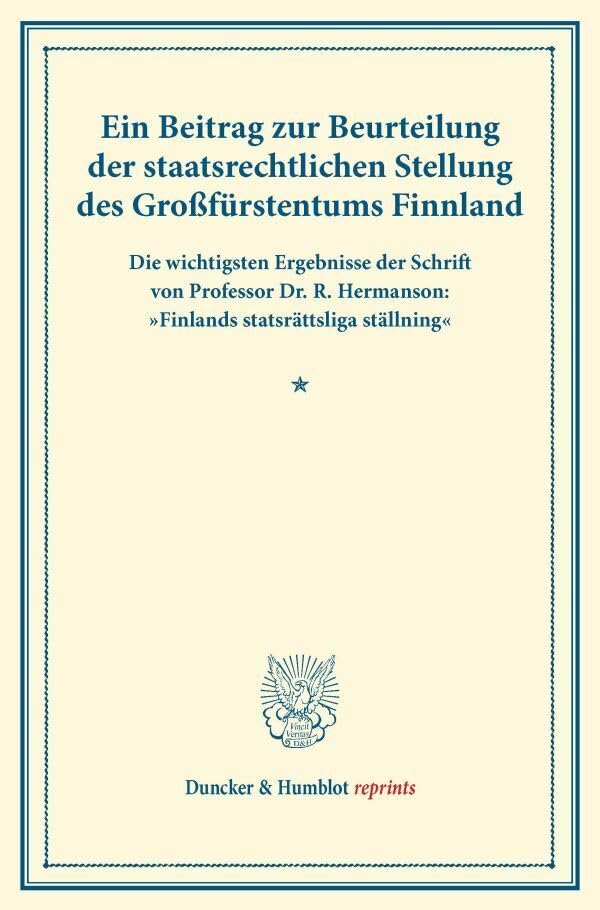 You are about to access our book library "Ein Beitrag Zur Beurteilung Der Staatsrechtlichen Stellung Des Grossfurstentums Finnland: Die Wichtigsten Ergebnisse Der Schrift Von Professor Dr. R. ... (Duncker & Humblot Reprints) (German Edition) full version"
