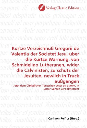 You are about to access our book library "Kurtze Verzeichnuß Gregorii de Valentia der Societet Jesu, uber die Kurtze Warnung, von Schmidelino Lutheranen, wider die Calvinisten, zu schutz der ... newlich in Truck außgangen (German Edition) full version"