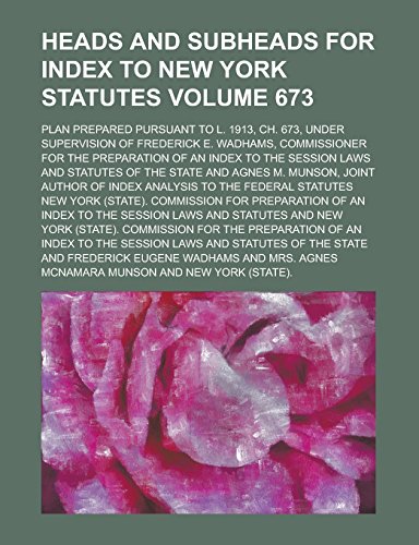 You are about to access our book library "Heads and Subheads for Index to New York Statutes; Plan Prepared Pursuant to L. 1913, Ch. 673, Under Supervision of Frederick E. Wadhams, Commissioner ... Session Laws and Statutes of the Volume 673 full version"