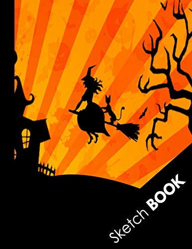 Sketch Book: Halloween Gifts for School Girls: Flying Witch Spell and Black Cat Orange Large Sketchbook: Perfect Gift For Creative Artists, Great for Drawing And Doodling full version