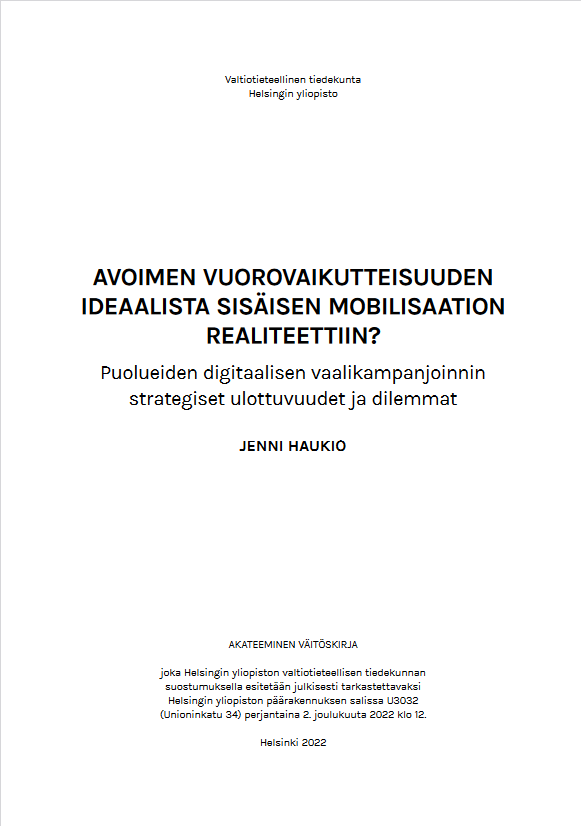 Avoimen vuorovaikutteisuuden ideaalista sisäisen mobilisaation realiteettiin?: Puolueiden digitaalisen vaalikampanjoinnin strategiset ulottuvuudet ja dilemmat full version